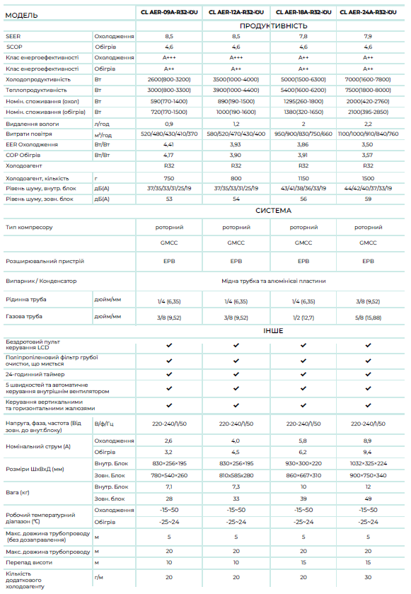 Environmentally friendly refrigerant R32. A modern and environmentally friendly refrigerant. Advantages compared to R410A: no impact on ozone content in the air (less impact on global warming), higher energy efficiency, high thermal conductivity and cooling capacity.