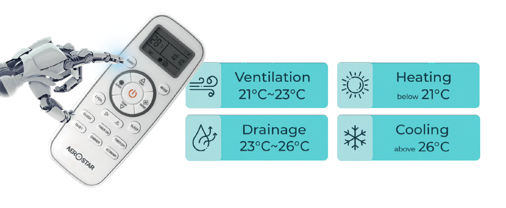 Simply select the desired room temperature and SMART mode, and a special free logic algorithm will determine the air conditioner mode and the best fan mode settings.