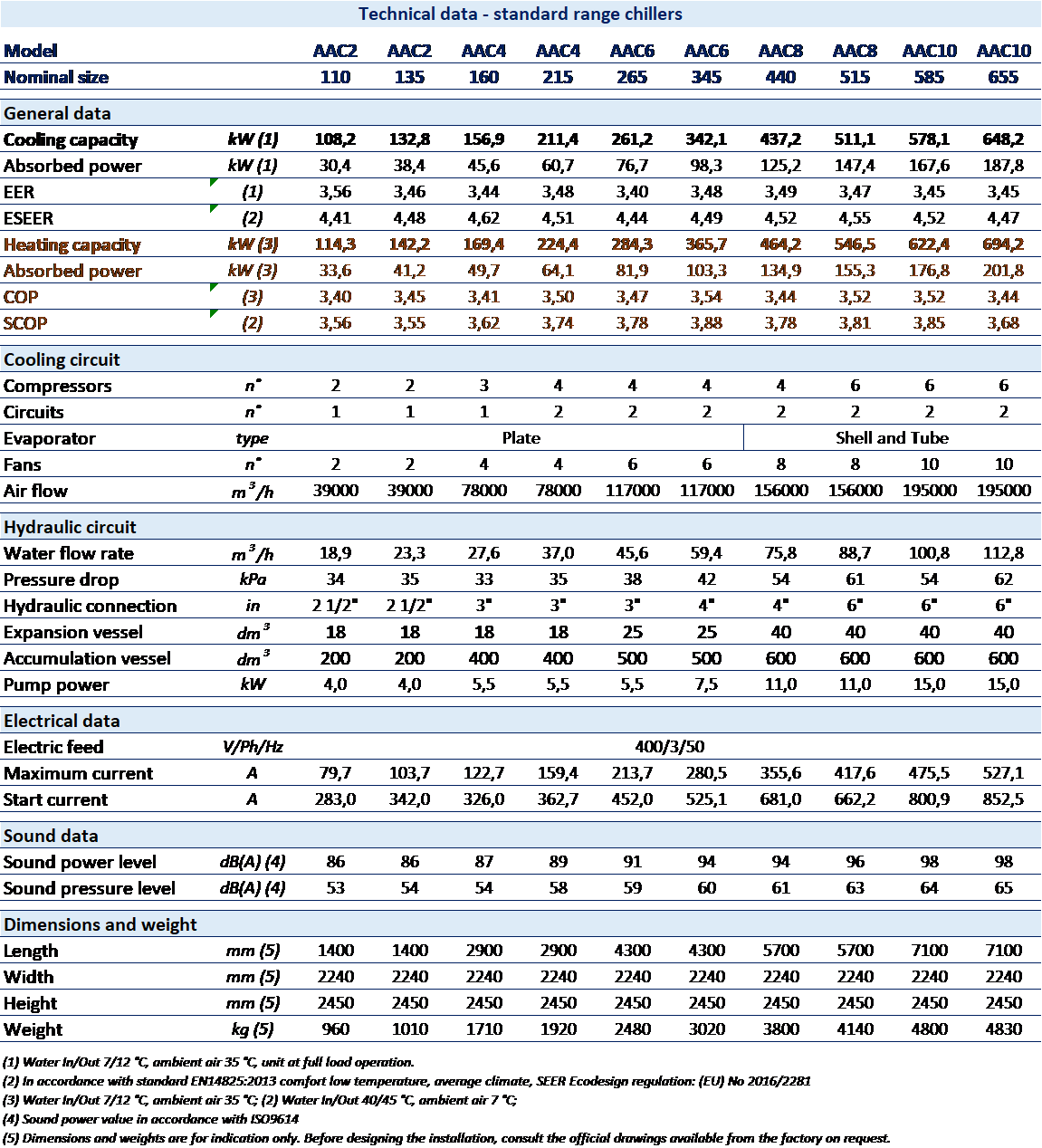 Recognized brand hermetic scroll compressors with axial and radial compliance for superior reliability and efficiency, equipped with crankcase heaters. Low sound and vibration level compressors installed on anti-vibration mountings, optionally equipped with sound jackets or structural covering.