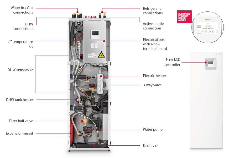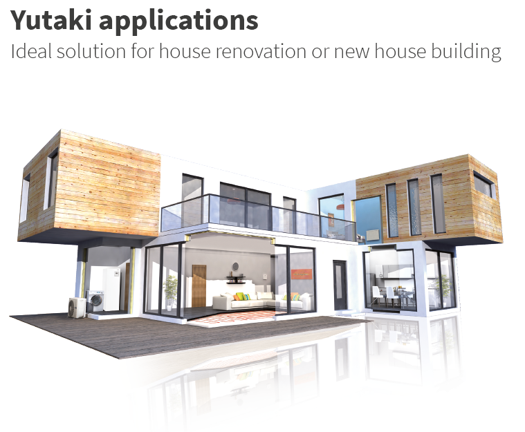 Yutaki can be connected to all kind of emitters such as underfloor heating, radiators or fancoils. Combination with other systems like boiler, solar panels or swimming pool is also easy to do as all controls are embedded in standard in Hitachi Yutaki.
