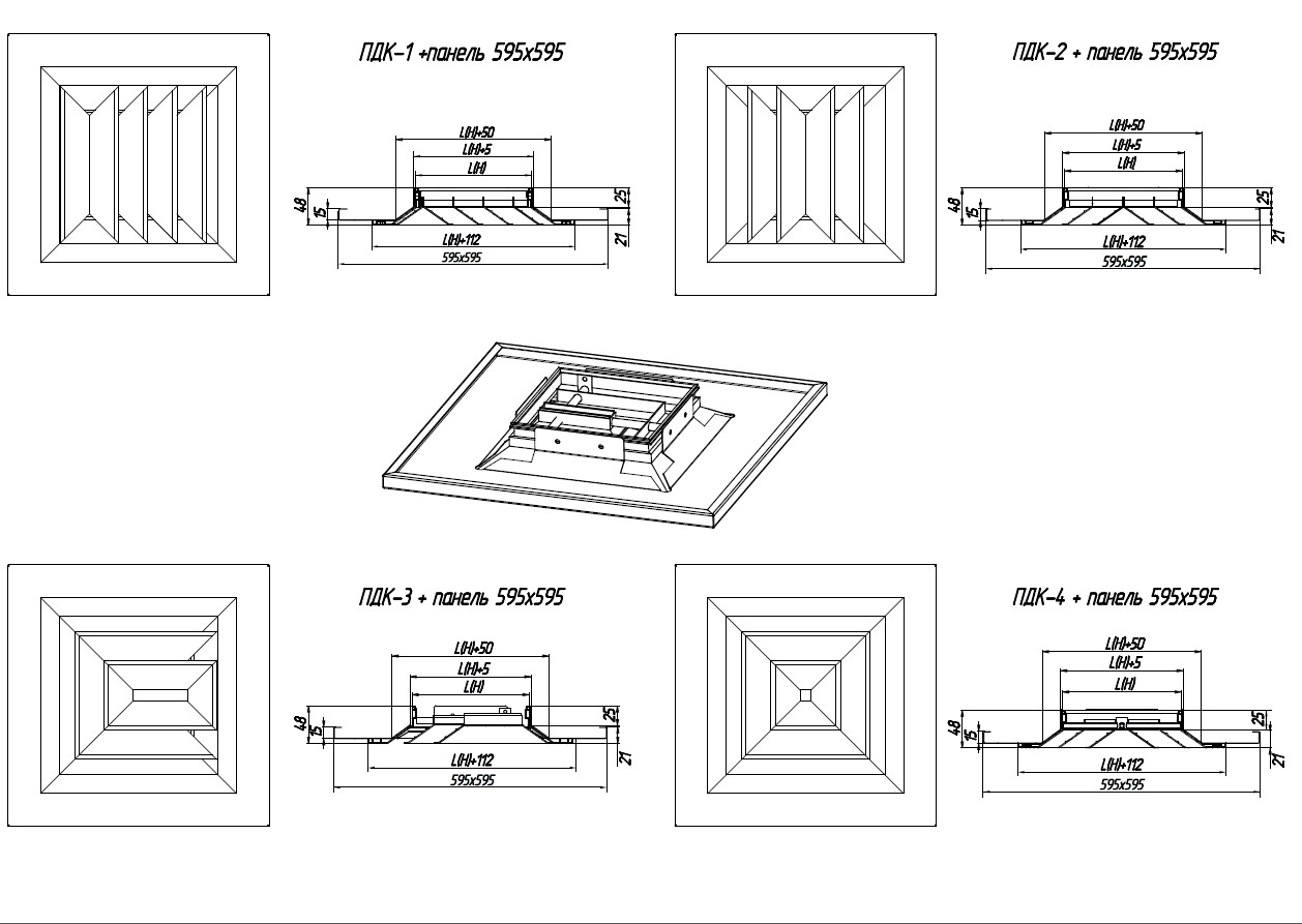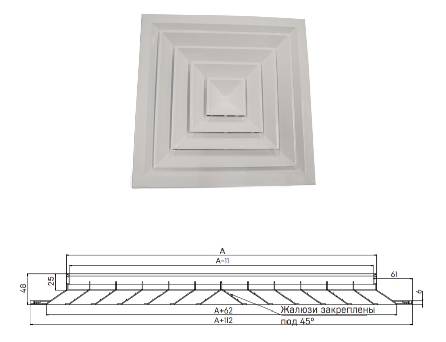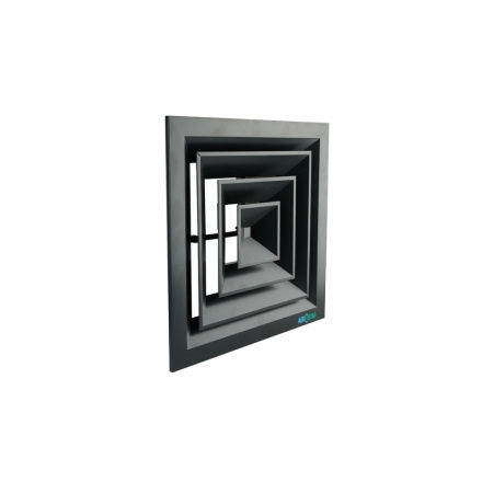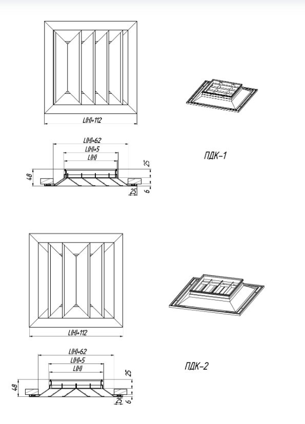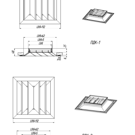 ПДК-1 – is a diffuser with a 1-way of stream flow spreading, non-adjustable, the inner part is not removable. They are installed when there are overhanging structures (beams) on the ceiling or when it is required to supply air in one direction and are installed in rooms near the wall.