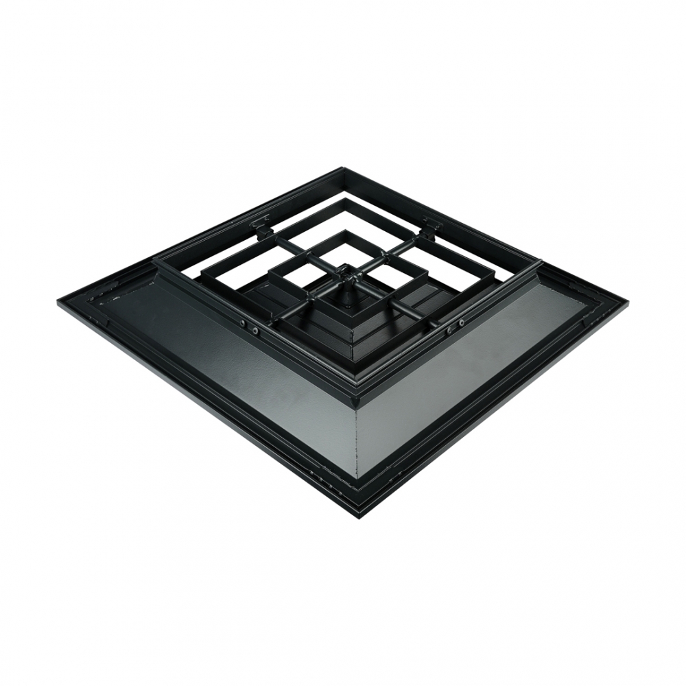 ПДК-2 * (RAL 9016) 225x225 + 595x595 panel (RAL 9005) – two-way spreading, screw mounting (mounting holes are located on the front side of the grille frame), white colour, connected to a black panel with dimensions 595x595 for mounting in a suspended ceiling of the "Armstrong" type.