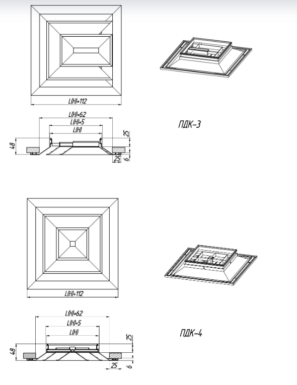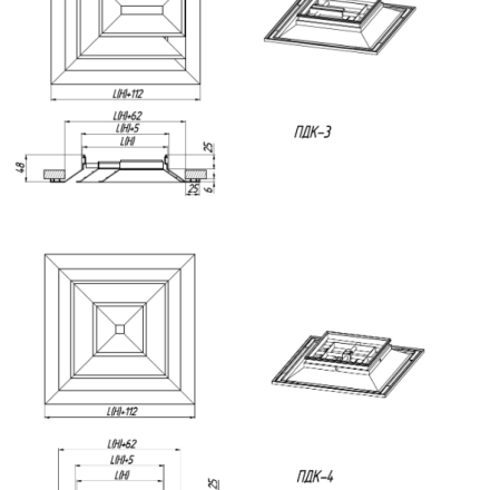 ПДК-3 - diffuser with 3- way of stream flow spreading, non-adjustable, the inner part is not removable. They are installed on the ceiling near the wall or column and form the three-way air flow distribution.