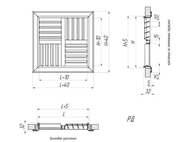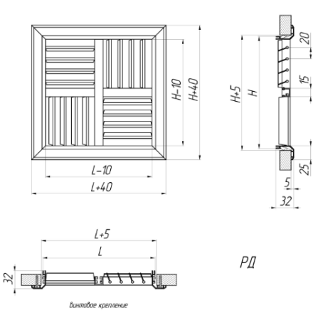 РД * (RAL9016) 300x300h – screw mounting (mounting holes are located on the front side of the grille frame), white colour.