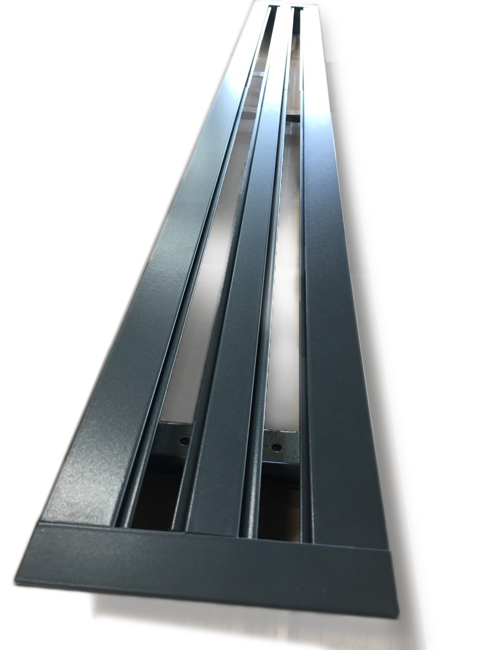SD-1-2 (RAL-9016/9005) L = 500 – with 1 slot, 2 – with 2 side flanges (closed edges). They are used for elements up to 2 meters long. Frame colour – white, louvers – black.