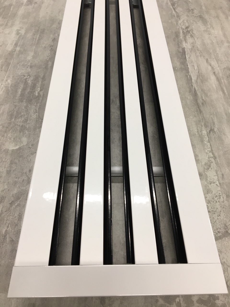 The louvers on the frame are movable, rotary, and provide regulation of the air direction in the room. Several elements can be connected so that they can be assembled in continuous lines of almost any length and shape.