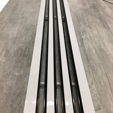 SD-3-0 (RAL-9016/9005) L = 1500 – with 3 slots, 0 – without side flanges (used as a middle element when installing several slot diffusers in one line). They are used for elements over 4 meters long. Frame colour – white, louvers – black.