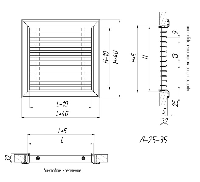 Л-25-35 – linear, single-row, non-adjustable grilles with 0° deflection angle of the vanes.