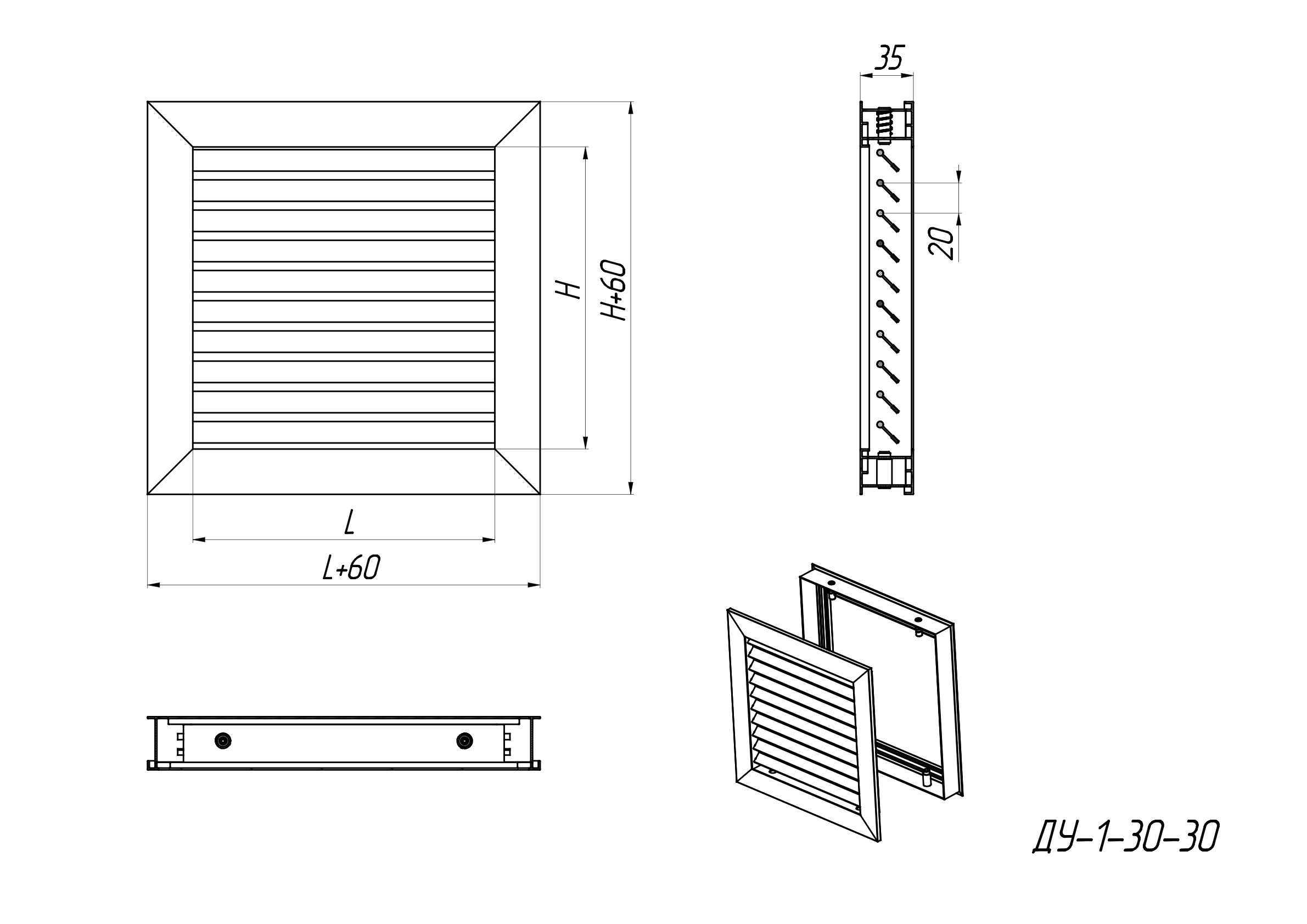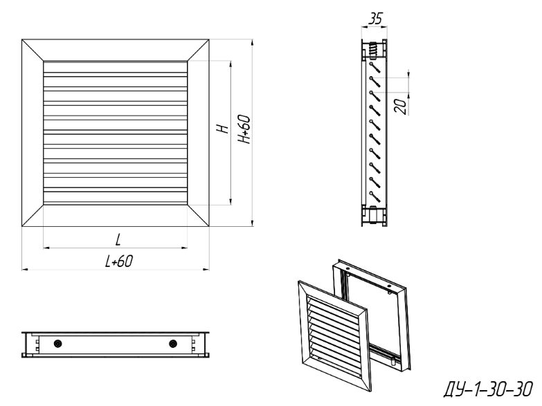 ДУ-1-30-30* (RAL-9016) 600х500h – installation with the help of screw mounting of frame 1 (mounting holes are located on the front side of the grille frame), white colour.