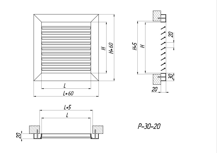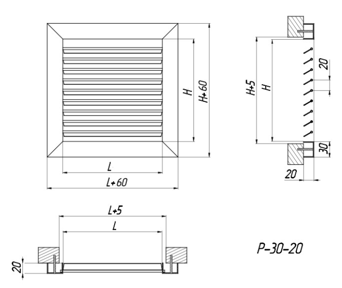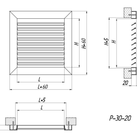 The design of the Р-30-20 grilles is a U-shaped frame with individually adjustable rotary louvers installed in it, designed for air supply or exhaust in ventilation, air heating and air conditioning systems. They are made of high-quality aluminium profiles, which are covered with powder paint, which provides reliable protection against negative environmental factors and prevents premature wear of the product.