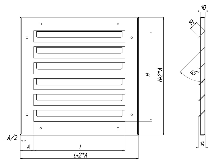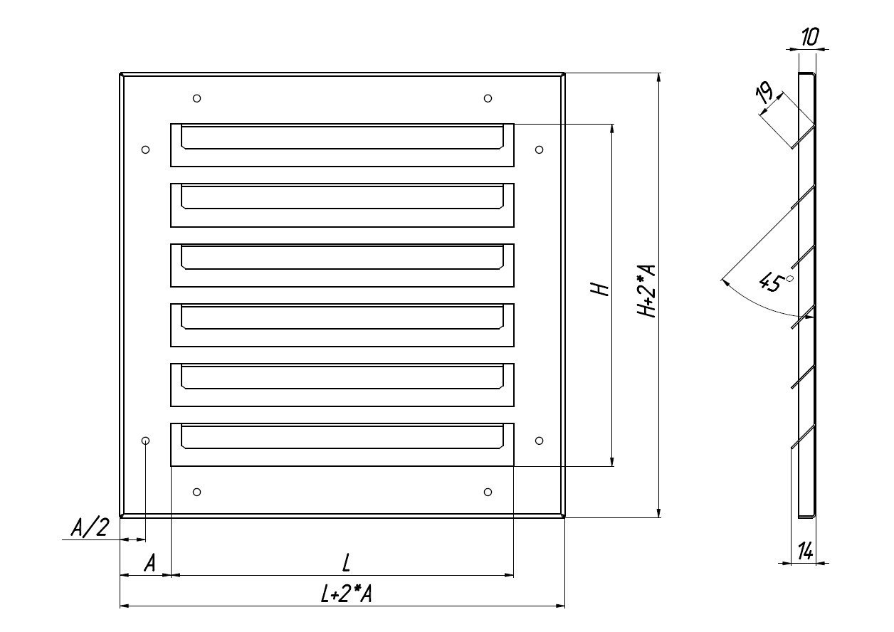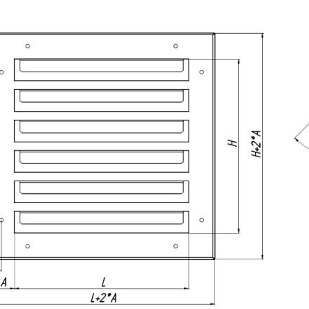 The rigidly fixed louvers at an angle of 45° give the grille strength and a pleasant aesthetic appearance. The width of the frame of this grille can be different and is indicated in the application.