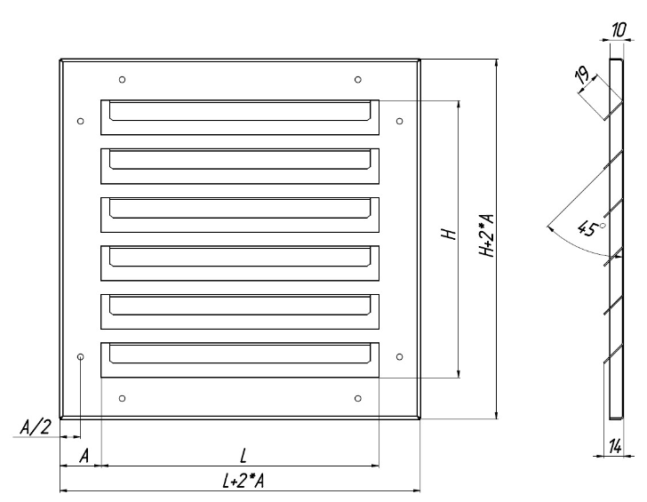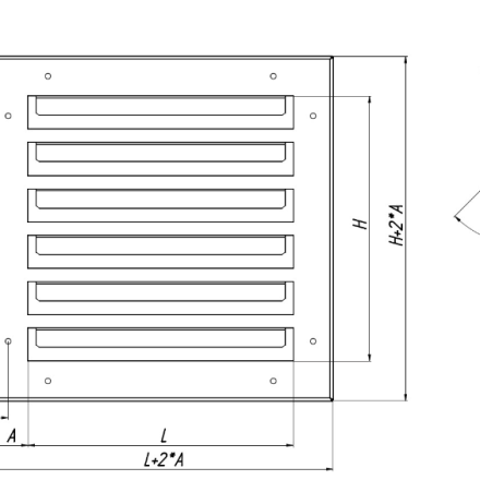 The rigidly fixed louvers at an angle of 45° give the grille strength and a pleasant aesthetic appearance. The width of the frame of this grille can be different and is indicated in the application.