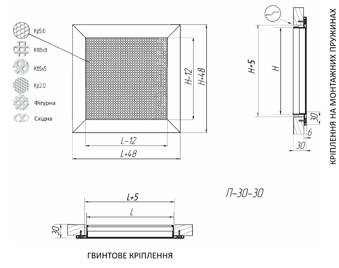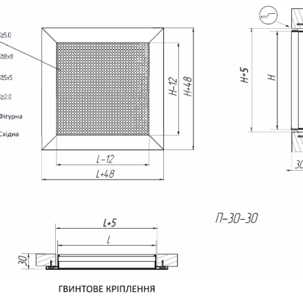 (-Kв 5x5) - “-“ the perforated sheet is not fixed, but lies in the grooves of the frame, Type of perforation (Кв - square, 5x5 - cell size)