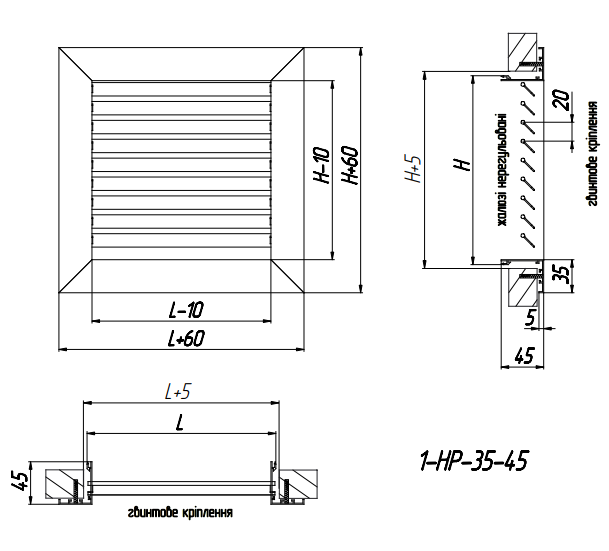 The grids are made of high quality aluminum profiles in the form of a frame, and consist of horizontal fixed plates, which are arranged at an angle of 45° and a pitch of 20 mm.