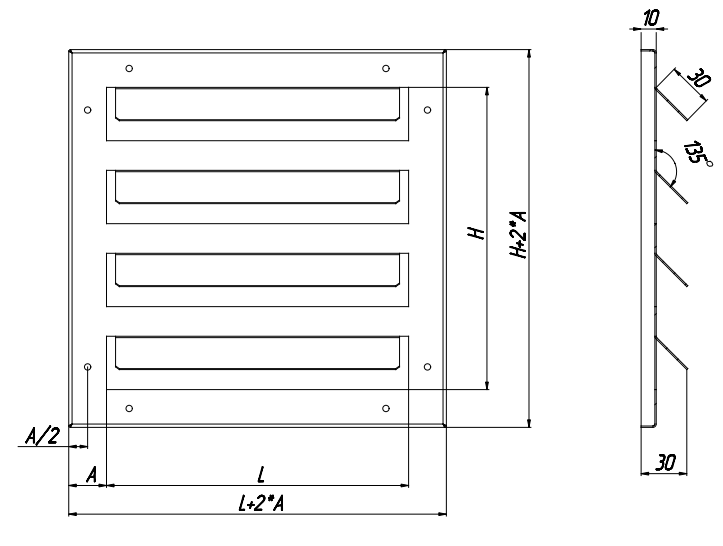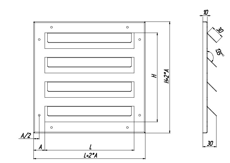 Pressed grilles are made from solid sheet (galvanized or stainless steel) by stamping and forming horizontally arranged non-adjustable blinds bent outwards at an angle of 45°. The louver frame is bent inwards along the perimeter and has a height of 10 mm. They are designed for air supply or removal by ventilation, air conditioning or smoke exhaust systems. Galvanized grids are powder coated, which provides reliable protection from negative environmental factors and prevents premature wear of the product. The standard paint color is white, but at the request of the Customer it is possible to paint in another color according to the RAL catalog.