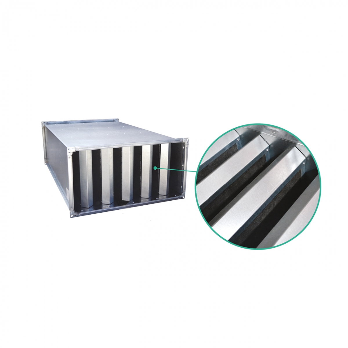 The plates are filled with non-combustible sound-absorbing material with a coating that prevents particles of material from entering the air duct.