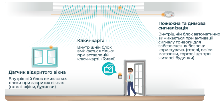 La unitatea interioară pot fi conectate dispozitive externe și senzori pentru gestionarea energiei. Pot fi conectate simultan dispozitive precum un card de acces la camera de hotel, un contact la fereastră și o alarmă de incendiu.