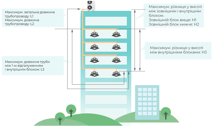 Tehnologia invertorului Aerostar și tehnologia de răcire pe două niveluri permit lungimi mai mari ale conductelor și o diferență de înălțime semnificativ mai mare. Sistemul de aer condiționat poate fi implementat într-un mod mai flexibil.