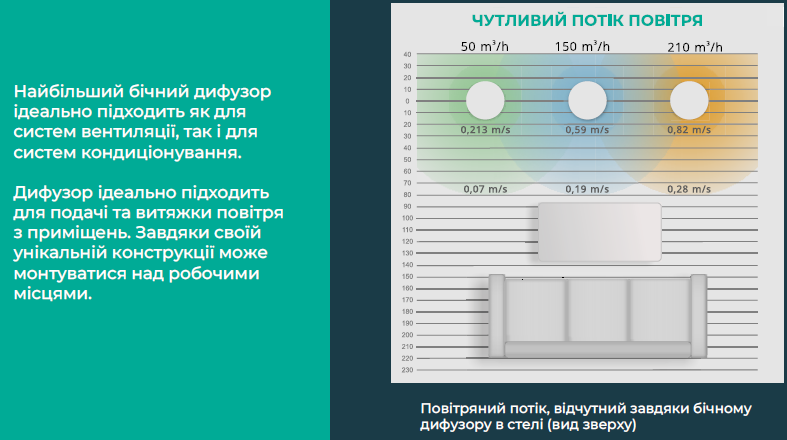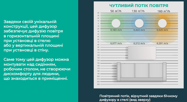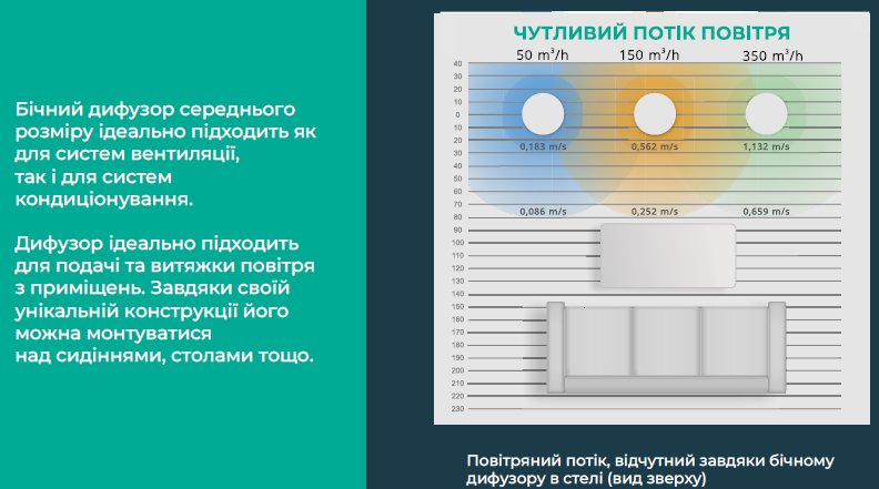 Difuzoarele SIDE sunt atractive ca soluție pentru designul interior, iar construcția lor unică asigură distribuția aerului pe suprafața pe care sunt montate. Acestea pot avea formă rotundă sau pătrată.