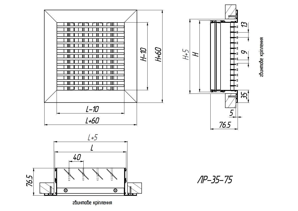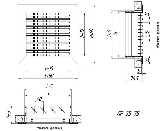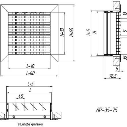 LR-35-75 - grile liniare, cu două rânduri, nereglabile, cu un unghi de deviație a plăcilor de 0° și un al doilea rând cu lamelă mobilă dispusă vertical Prin schimbarea poziției lamelelor (unghiul de înclinare este selectat individual și reglat independent unul de celălalt), direcția fluxului de aer poate fi reglată.