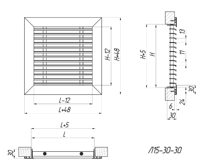 L15-30-30 - grătare liniare, cu un singur rând, nereglabile, cu un unghi de deviație a plăcii de 15°.