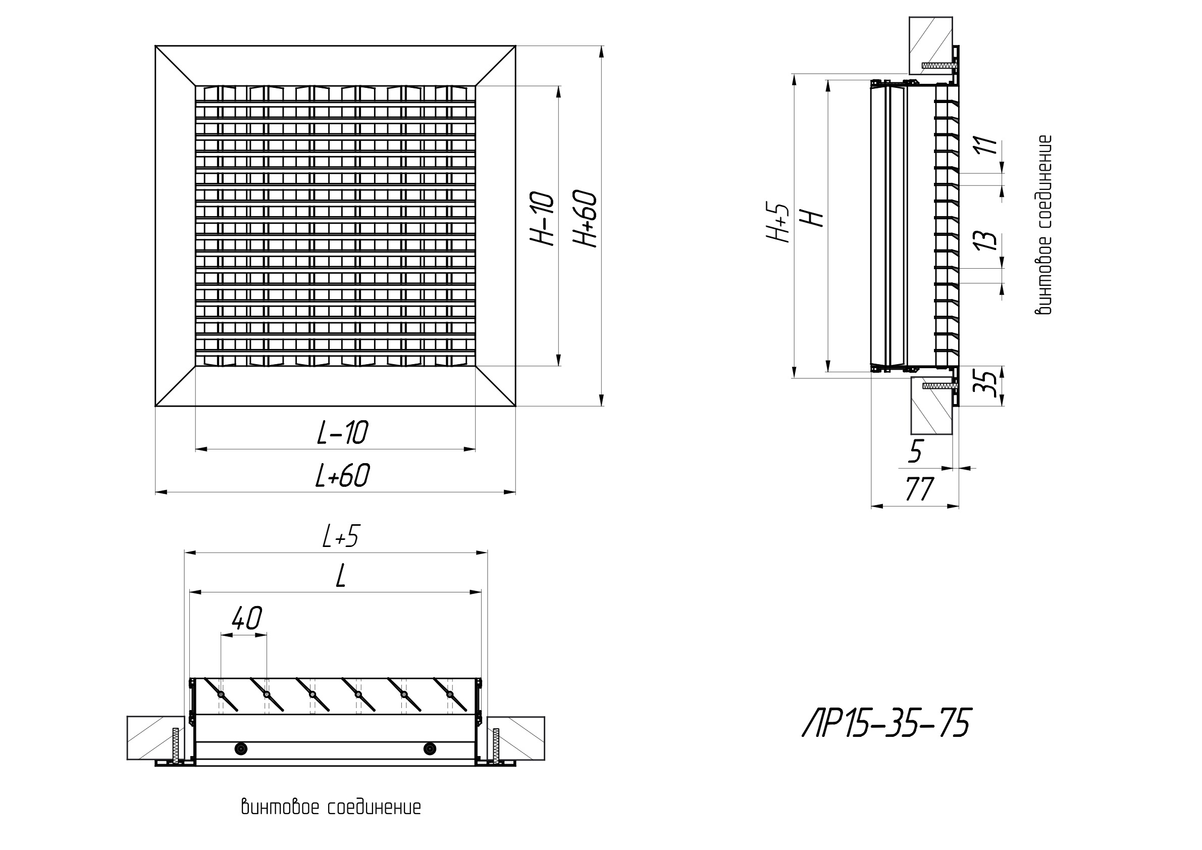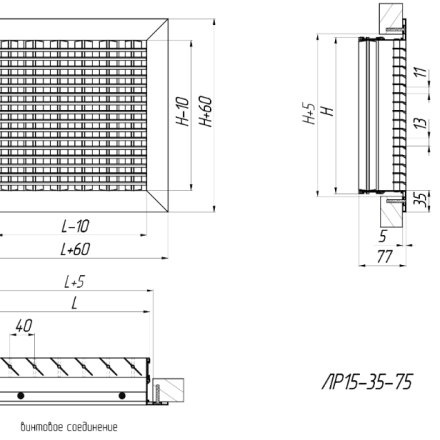 LR15-35-75 - grătare liniare, cu două rânduri, nereglabile, cu un unghi de deviere a plăcii de 15 ° iar al doilea rând cu lamele mobile dispuse vertical, prin schimbarea poziției cărora (unghiul de înclinare este selectat individual și este reglat independent unul de celălalt), puteți regla direcția fluxului de aer.