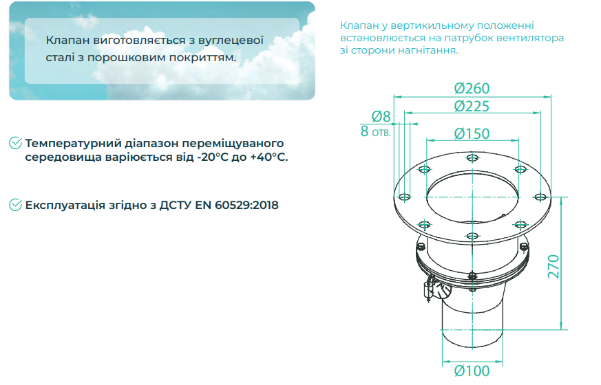 Acest tip de supapă este un accesoriu opțional pentru ventilatorul electric manual. Această supapă închide orificiul de evacuare al ventilatorului atunci când ventilatorul este oprit sau când puterea este redusă.