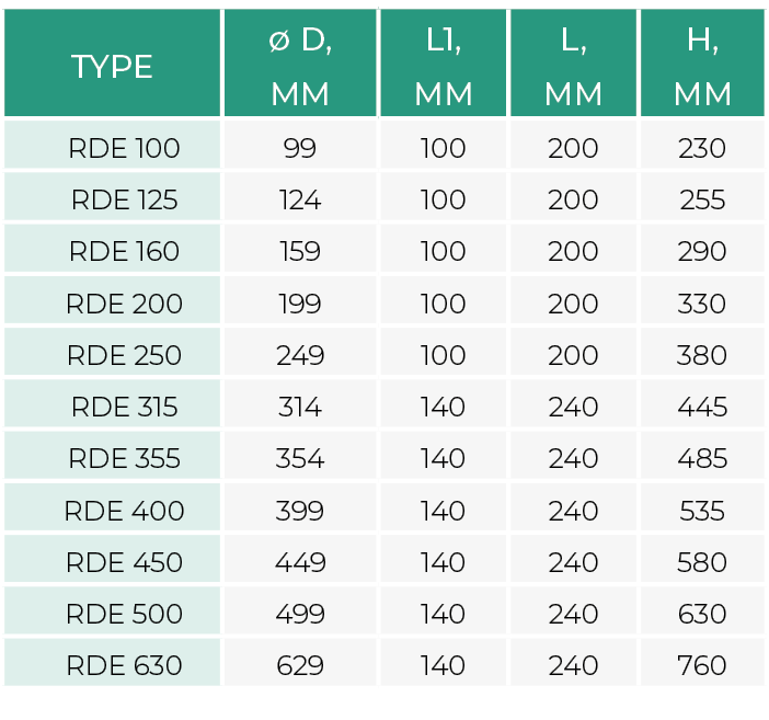 Amortizoare RDE pentru închiderea și controlul fluxului de aer, ușor de instalat în sisteme de conducte circulare. Acestea pot fi instalate în orice poziție. Corpul este fabricat din oțel galvanizat. Paletele de închidere pot fi rotite la un unghi de 0-90°C cu ajutorul motoarelor. Sunt echipate cu o garnitură de cauciuc, care crește densitatea clapetei în poziția închisă.