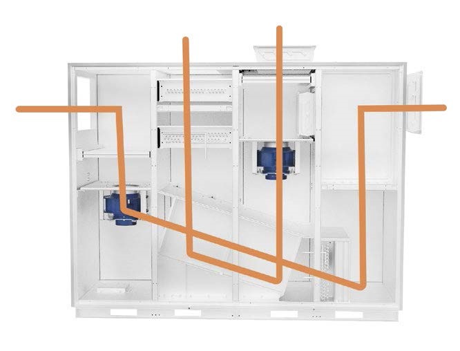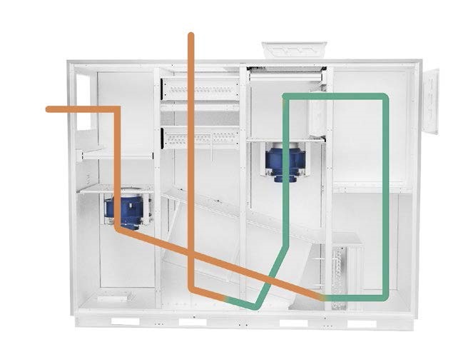 Aerul de alimentare trece prin recuperator, în timp ce pompa de căldură este comutată în sens invers, eliminând excesul de căldură și umiditate din aerul de alimentare.