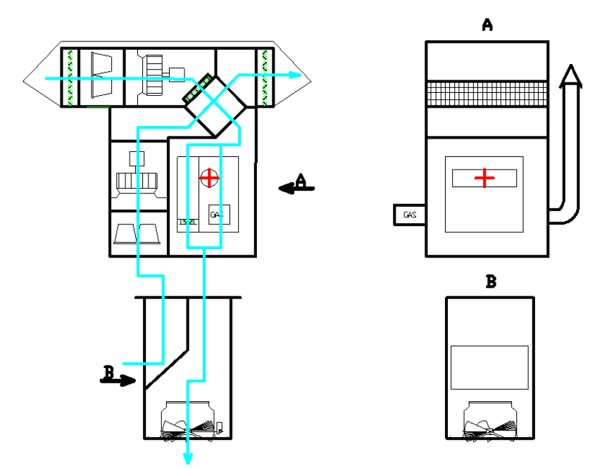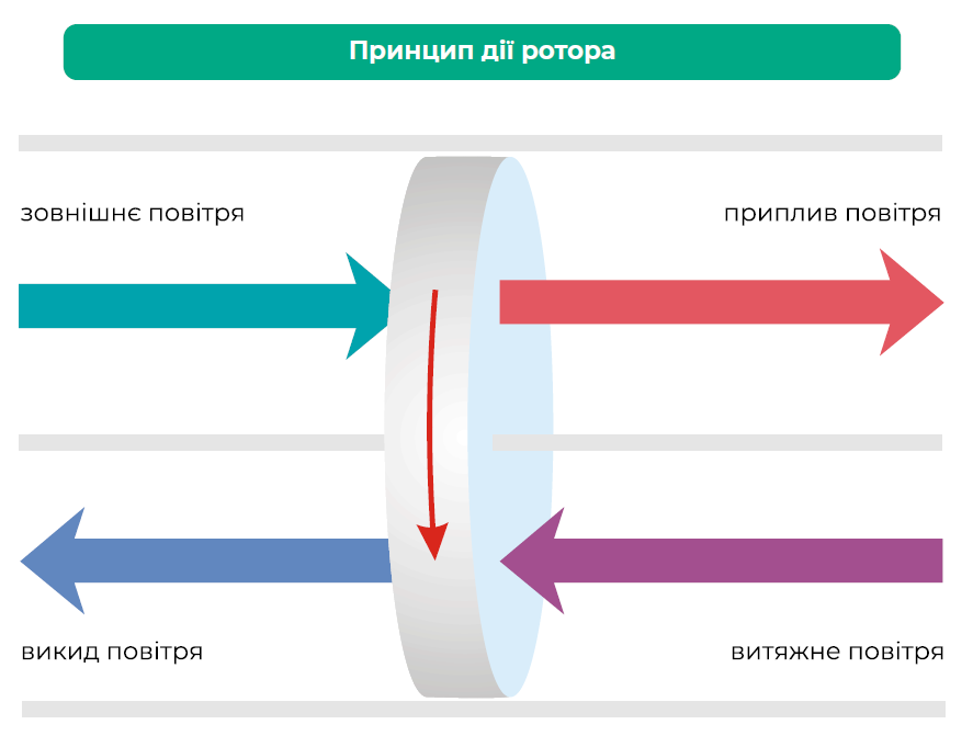 o unitate de alimentare și evacuare care utilizează un schimbător de căldură rotativ conceput pentru a încălzi aerul de alimentare utilizând schimbătorul de căldură încorporat și, dacă este necesar, utilizând modul de amestecare a fluxurilor de aer în secțiunea goală.